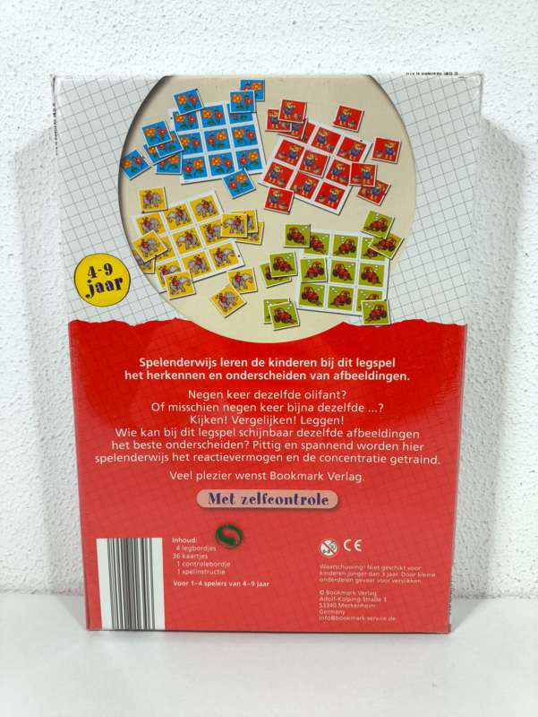 Spelenderwijs leren de kinderen bij dit legspel het herkennen en onderscheiden van afbeeldingen. Negen keer dezelfde olifant? Of misschien negen keer bijna dezelfde? Kijken en vergelijken. Wie kan bij dit legspel schijnbaar dezelfde afbeeldingen het beste onderscheiden? Pittig en spannend worden hier spelenderwijs het reactievermogen en de concentratie getraind.