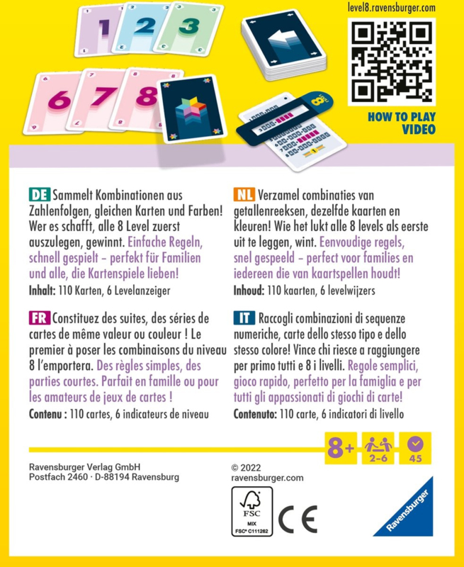 Verzamel combinaties van getallenreeksen, dezelfde kaarten en kleuren! Wie het lukt alle 8 levels als eerste uit te leggen, wint. Eenvoudige regels, snel gespeeld – perfect voor families en iedereen die van kaartspellen houdt!