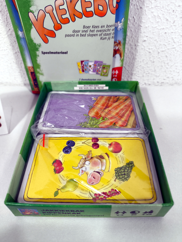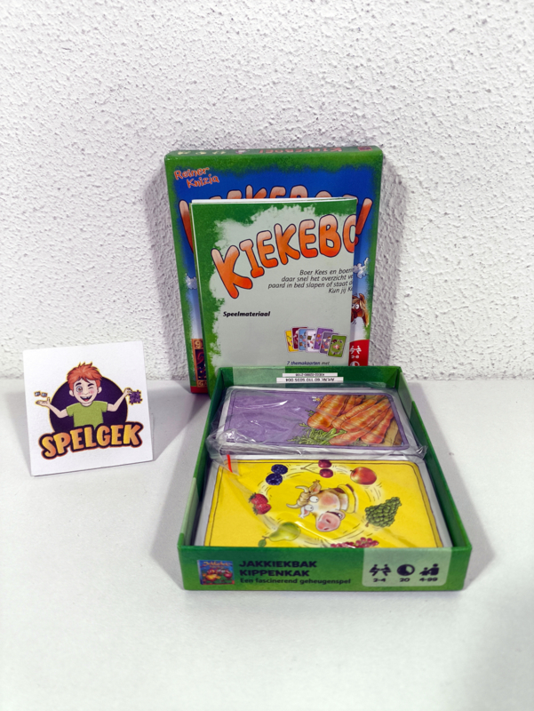 Het is een grote chaos op de boerderij. Alles van het paard, het hondenhok, de melk tot de boer zelf is verstopt. Wie vindt alles terug? Bij Kiekeboe! ligt een rij van kaarten in 7 kleuren op tafel. Op alle kaarten staan verschillende voorwerpen afgebeeld. Iedereen mag even kijken wat er op de kaarten staat, voordat de hele rij wordt omgedraaid. Daarna wordt per beurt een nieuwe kaart in een van de kleuren getoond. Je moet dan zo snel mogelijk raden welk voorwerp bij die kleur in de rij verstopt zit. Wie zo de meeste voorwerpen raadt, wint het spel! Kiekeboe! is een vrolijk reactiespel, waarbij je goed moet onthouden wat je op de kaarten ziet. Het spel is ideaal voor jongere kinderen, maar is met een groot aantal deelnemers ook hilarisch voor oudere spelers.